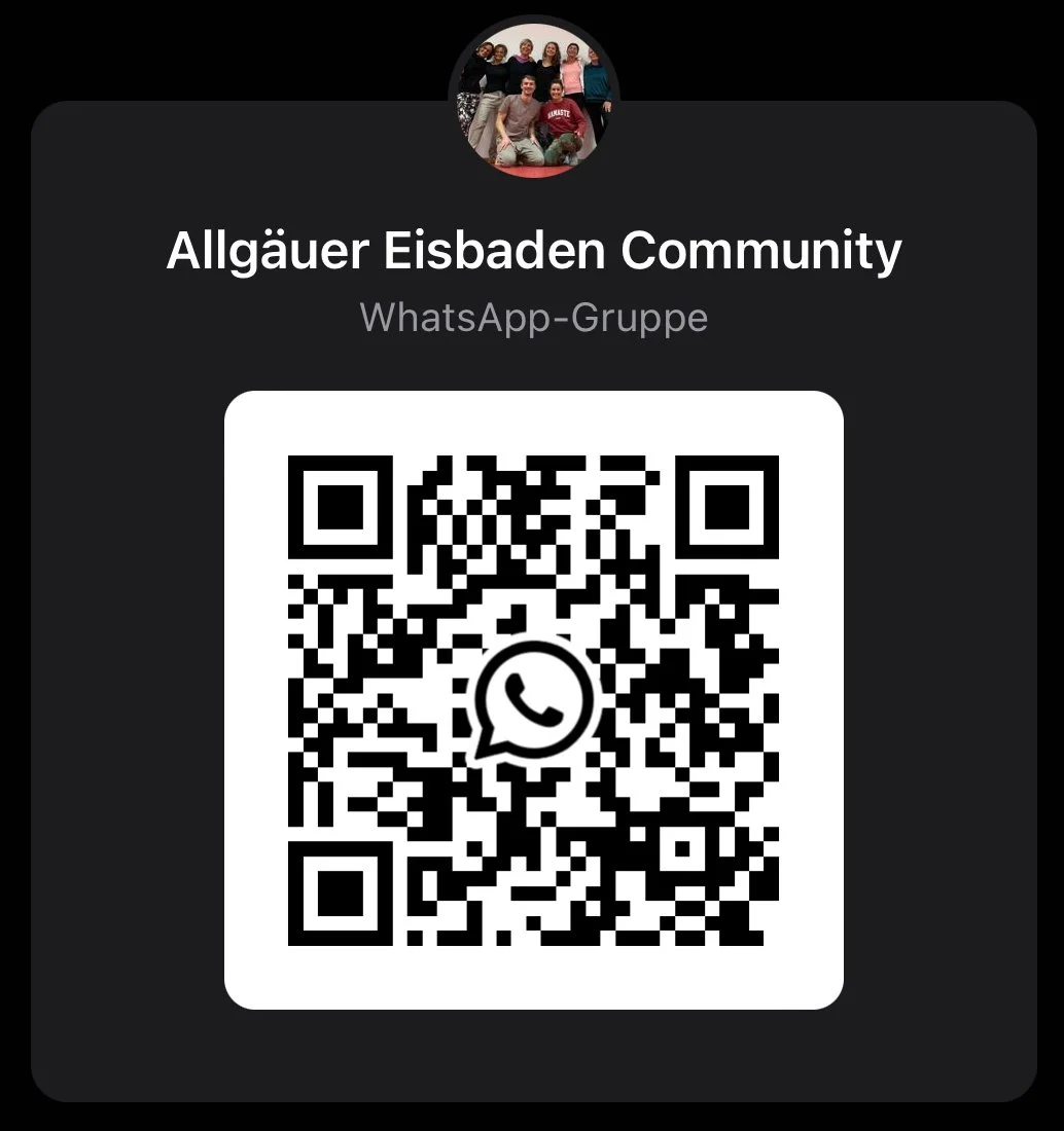In 2023 wurde die Allgäuer Eisbaden Community gegründet. Eine WhatsApp Gruppe zum gemeinsamen Eisbaden. Alle haben die Möglichkeit ein geplantes Eisbaden Event anzukündigen, um weitere Enthusiasten zu finden. Schließlich macht Eisbaden mit anderen deutlich mehr Spaß als allein. Du hast die Chance neue Menschen kennenzulernen und Erfahrungen auszutauschen. Jedes Eisbad ist freiwillig, kostenlos und auf eigene Verantwortung. Melde dich mittels QR Code an oder sende mir eine Nachricht via Mail mit Namen + Telefonnummer und ich füge dich zur Gruppe hinzu.
